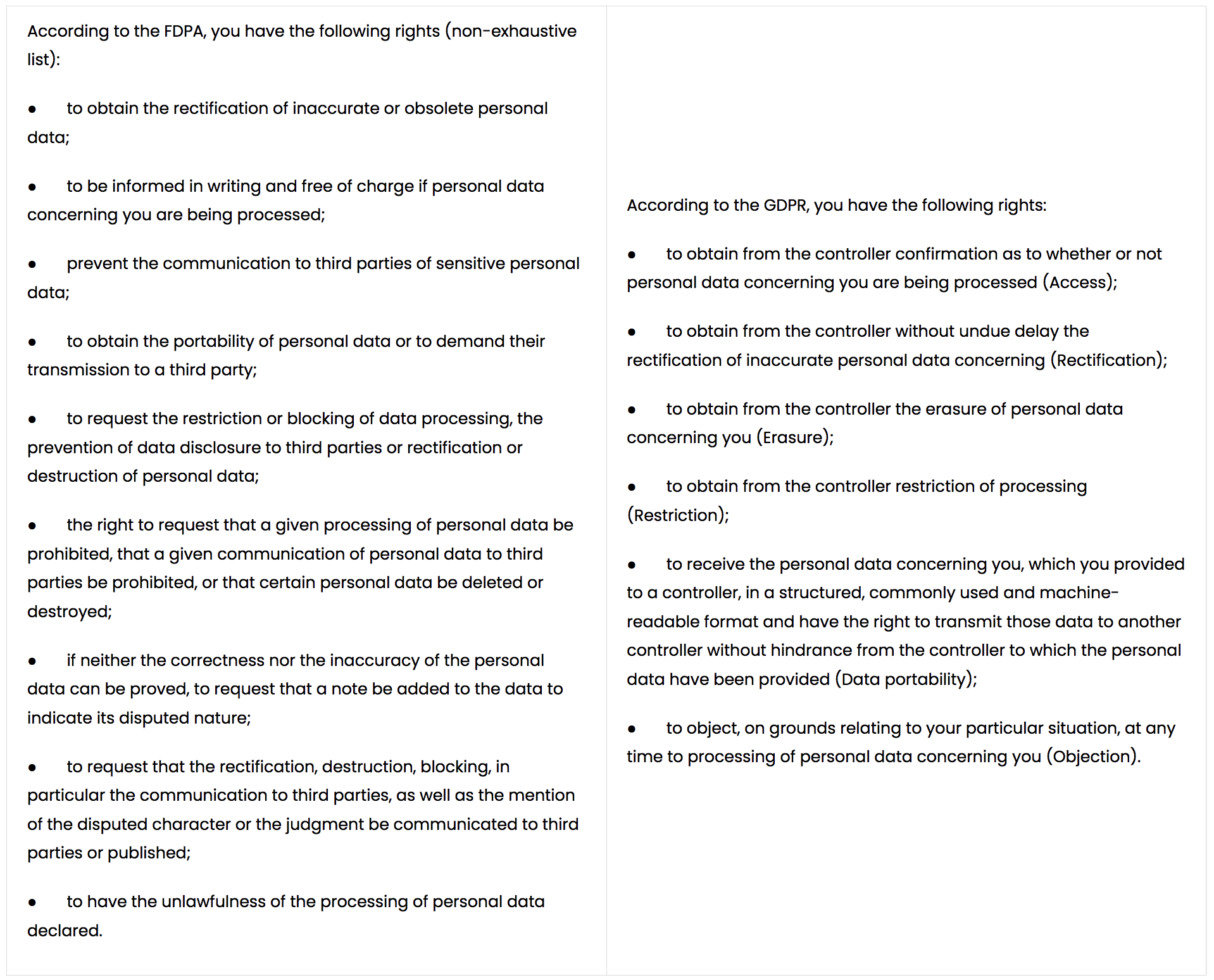 You may exercise your rights under the FDPA and GDPR (to the extent applicable) by contacting the Data Controller by writing to the above addresses.